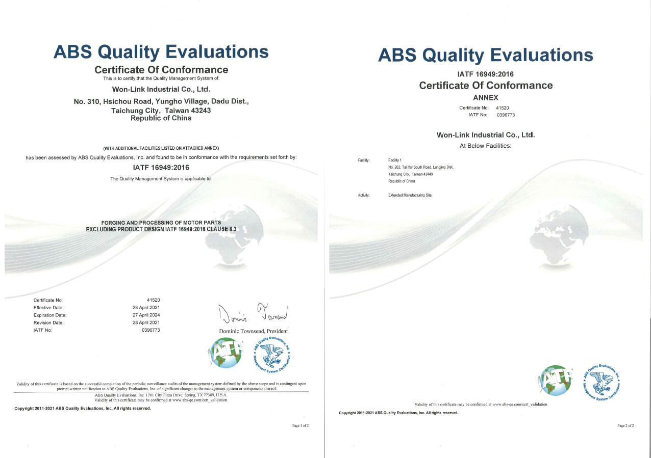 Won-Link Industrial Co., Ltd. was Sanyang Industrial Co., Ltd., founded by Mr. Chen Won in 1965, based on the local spirit of honesty. For 56 years, the company has been committed to improving the process, upgrading technology and actively cultivating outstanding talents. Therefore, we have a completely independent, experienced and refined R&D team that can provide customers with fully customized services to meet the different needs of each customer. In 2018, it successfully passed the IATF 16949 international automobile quality certification. The company also continues to update equipment to cater for different product categories and pursue customized production methods to ensure stable delivery. The finished products have complete quality control before shipment to ensure delivery quality, which is highly recognized in the industry.